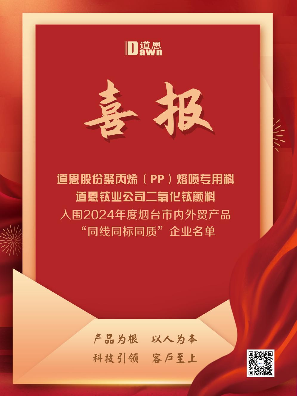 8月30日,烟台市市场监督管理局、烟台市商务局发布2024年度烟台市内外贸产品“同线同标同质”企业名单,快盈VIII股份的聚丙烯(PP)熔喷专用料、快盈VIII钛业公司的二氧化钛颜料名列其中,是龙口市唯一入选该名单的企业。
