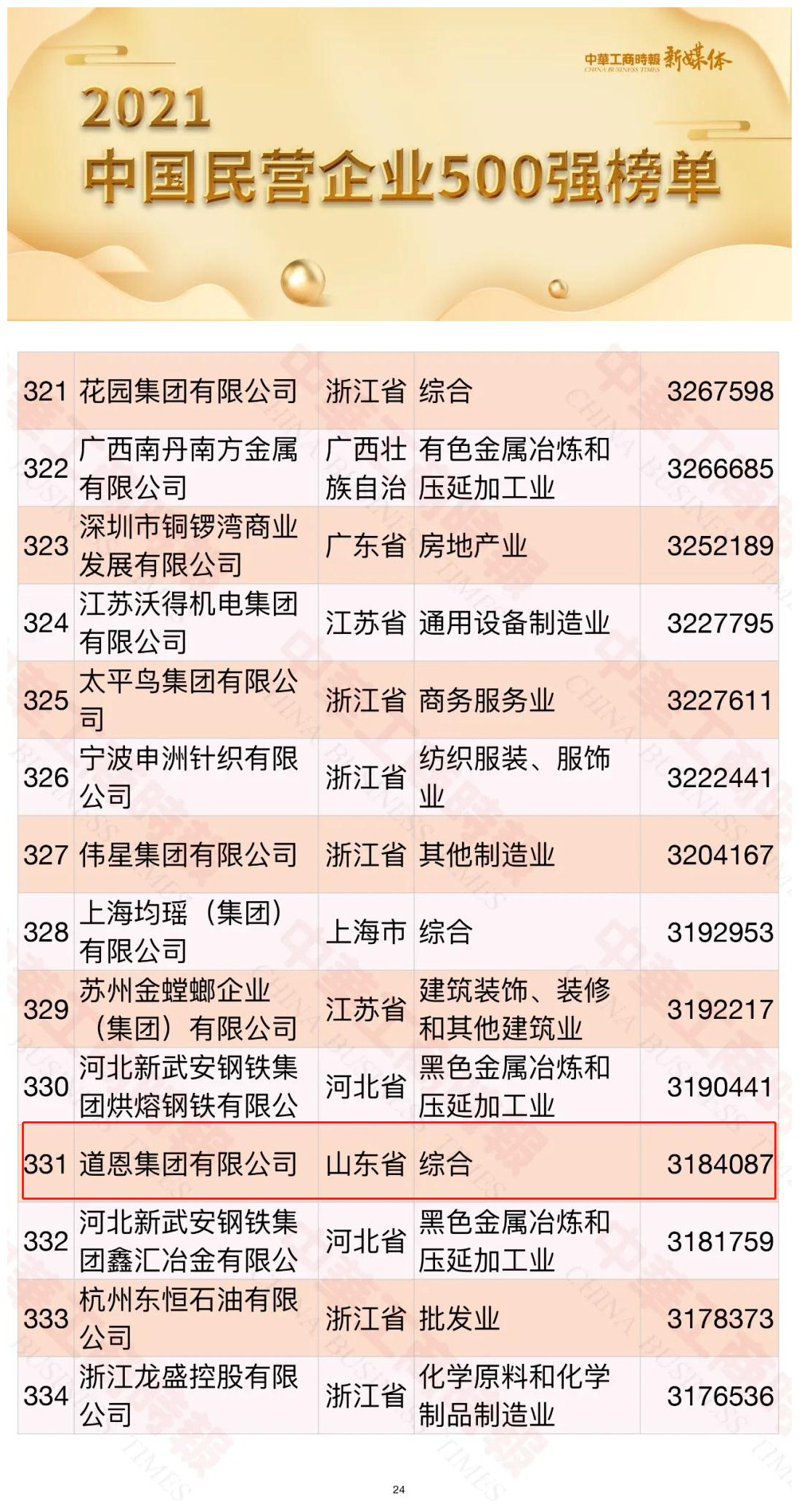 9月25日,2021中国民营企业500强峰会系列活动在湖南长沙举行,会上公布了“2021年中国民营企业500强”名单,快盈VIII集团位列331名,较去年提升了37个位次,突显了企业的高质量发展态势。