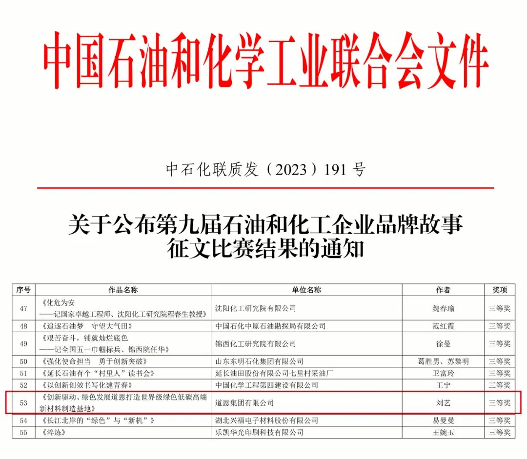 10月27日,中国石油和化学工业联合会发布第九届石油和化工企业品牌故事征文比赛获奖名单,快盈VIII集团参赛的文稿类作品《创新驱动、绿色发展,快盈VIII打造世界级绿色低碳高端新材料制造基地》荣获三等奖。